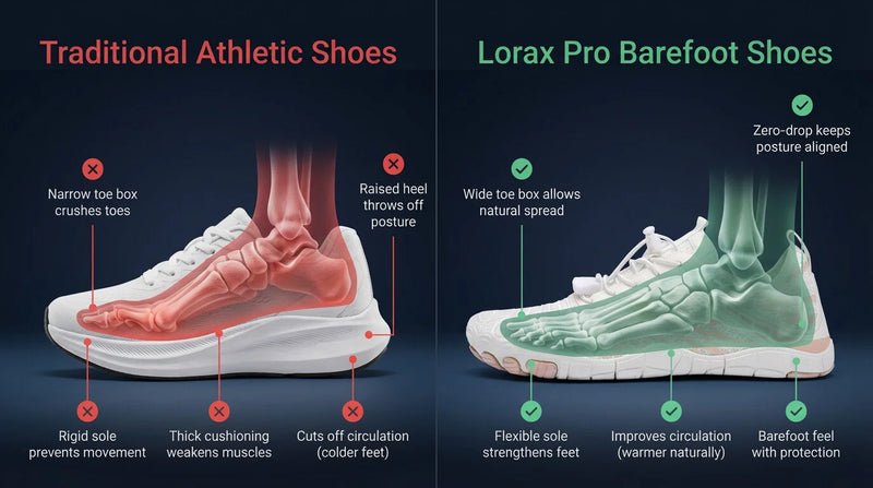 Most shoes work against your body's natural design. Elevated heels tilt your pelvis forward, narrow toe boxes crush your toes together, and stiff soles prevent the 33 joints in your feet from doing their job.